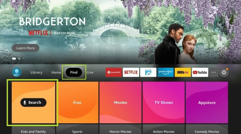- Cliquez sur l’option Rechercher > Rechercher sur l’écran d’accueil de la FireStick.